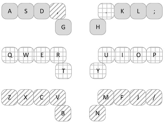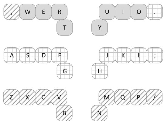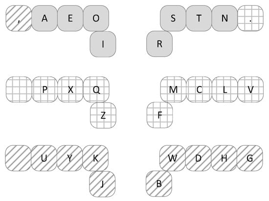 The second proposed VX-ORK+ type keyboard (Figure 6) is also the QWERTY keyboard adaptation. The default keys of the Q-VX-ORK+ keyboard form the first row of the QWERTY keyboard. Due to the assignment of dead keys to “Q” and “P” keys on the QWERTY keyboard, the letters “Q” and “P” are assigned to the “,” and “.” keys on the QWERTY keyboard.
