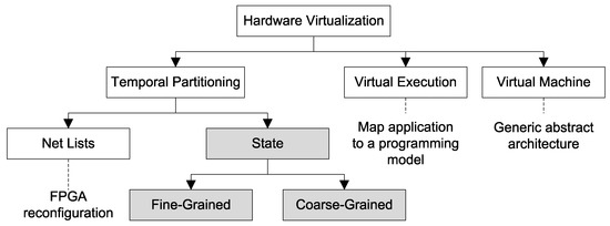 Hardware virtualization approaches. White boxes are described by Plessl and Platzner [11]. Gray boxes are described by Chuang [13].