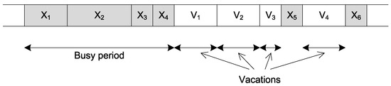 A vacation model is an approach to analyzing queueing systems where the server is not continuously available (e.g., the server is executing other jobs). Bertsekas and Gallager [22] describe M/G/1 queues (Markovian, or memoryless, arrival process; General service process; 1 server) where the server can go on “vacation” for some random interval of time. This is illustrated in Figure 3. Here, represents the service time of the jth job and represents the vacation time of the kth vacation. The model is as follows. When a job is waiting in the queue, the server will begin servicing the job and enter a busy period represented by . When the queue is empty, the server will go on vacation and enter a vacation period represented by . If a new arrival enters an idle system, rather than going immediately into service, it waits for the end of a vacation period, and then enters service. If there is no new arrival into the system, then the server, after returning from a vacation, will immediately go into another vacation period. General descriptions of vacation-based queueing models include Takagi [23] and Tian and Zhang [24].