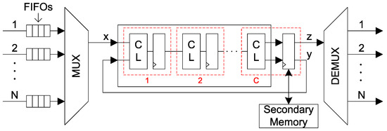General virtualized hardware configuration. It consists of a C-slowed sequential logic circuit and secondary memory supporting N data input/output streams.