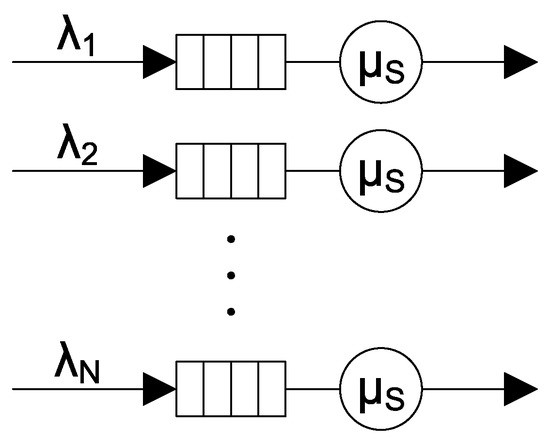 Queueing model of virtualized hardware with N queueing stations. Each queueing station (representing a data stream) consists of a FIFO queue and associated server representing oual copy of the hardware computation.