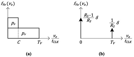 Next, for the case of a non-empty queue, the probability density function, , in Figure 7b, shows the distribution of the vacation waiting time for continuous random variable . In this figure, the impulses defined at 0 and are Dirac delta functions ( notation) where