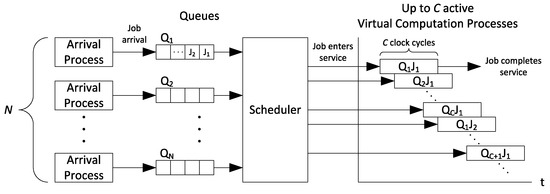 There are N arrival processes, one for each input queue that represents a virtual computation. Jobs arrive into the system with an interarrival time computed based on a given distribution (e.g., exponential, Erlang, hyperexponential, etc.). When a job arrives, it is put into the input queue. The server, composed of the scheduler and virtual computation processes, emulates the hardware design in Figure 4. Each input queue is visited according to the hierarchical round-robin scheduler described above in Section 3.2, taking one clock cycle or time per visit and time per context switch.