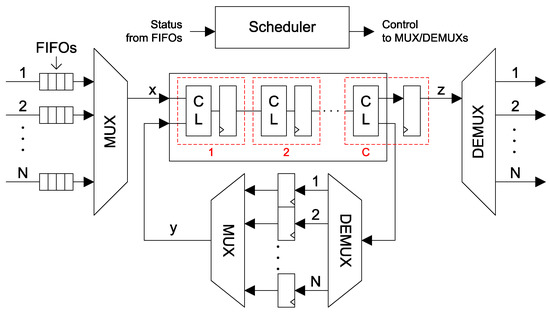 We consider a general virtualized hardware configuration in Figure 4 with fine- and coarse-grained context switching. An arbitrary sequential logic circuit (i.e., the HW block) is C-slowed and augmented with a secondary memory that can load and unload copies of the state to/from the “active” state register. N FIFO, or First In, First Out, buffers are present at the inputs to store data stream elements that are awaiting being scheduled. The circuit consumes one data element (from an individual input specified by the schedule) each clock tick.