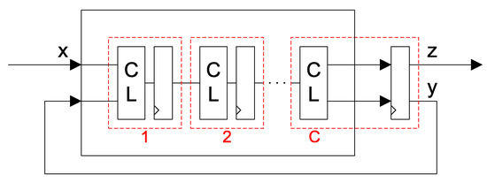 C-slow is a transformation described by Leiserson and Saxe [15] whereby every register in a digital logic circuit is replaced by C registers. This allows sequential logic circuits, which have feedback paths, to be pipelined and retimed. Retiming is a technique for improving the clock frequency of a circuit by moving pipeline registers forward and backwards through the combinational logic to shorten the critical path of the circuit. Retiming a C-slowed circuit can theoretically give up to C times improvement in the clock frequency.