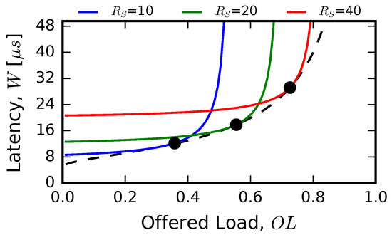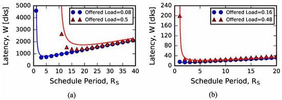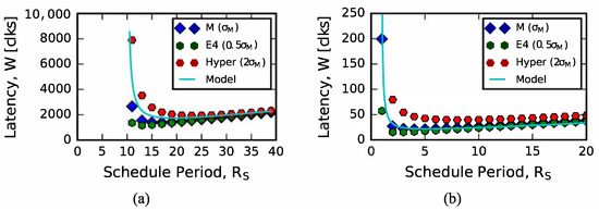 Plots of the latency vs. schedule period are shown in Figure 22a,b for the two candidate designs at one value of the offered load on each. From the plots, we can see that the model curve follows the exponential data points the closest as we expect. For the hyperexponential distribution (with ), we see increased latency and is significantly worse at high load where in the first design. For the Erlang distribution (with ), we see decreased latency, particularly at high load where in the first design and 1 in the second design.