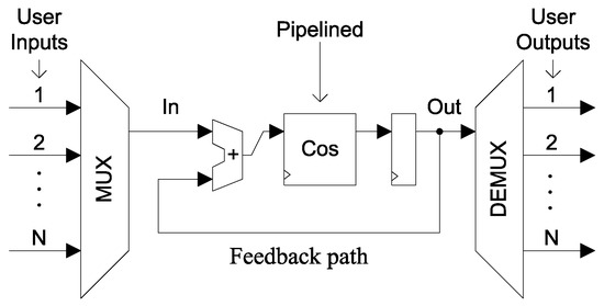 The core notion is illustrated abstractly in Figure 1. Here, a single physical copy of a hardware function is shared among N virtual “contexts,” or users. Context switching can either be fine-grained (i.e., single cycle, similar in style to simultaneous multithreading in modern processor cores [12]) or coarse-grained (i.e., scheduled with longer time quanta). If deployed in the cloud and used via the SaaS model, networking infrastructure would stream the users’ data to the input and stream the output results back to the users.