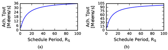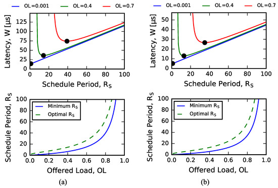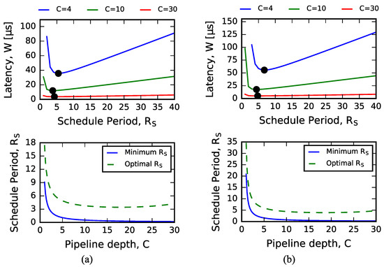 Latency prediction and optimization plots are shown in Figure 19a,b. In these results, N is fixed at 60 total streams, S is , and . In the latency plots, three curves are shown for different values of the pipeline depth (C) and the schedule period () is swept along the x-axis. We can see the same three regions in the latency plots: initial high latency which drops steeply, an optimal minimal latency, and then a gradual increase in latency with increasing . Of the three curves, we can see that the curve (with the highest C) has the lowest latency. This may be accounted for in part in that at high C, there are fewer context switches required.