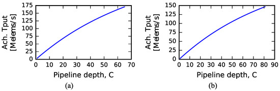Total achievable throughput is shown in Figure 18a,b for SHA-256 and SHA-512. In the plots, and (i.e., no secondary memory). As the pipeline depth (C) increases, more data streams can be computed in parallel, and the clock period () decreases (initially linearly). This causes the total aggregate throughput of all data streams to increase initially linearly as well. As C gets higher, starts to flatten out, causing the throughput to bend over. The pipeline depth is swept up to the maximum number of pipeline stages, 65 in SHA-256 and 81 in SHA-512. Above these values of C, the total achievable throughput will be flat.