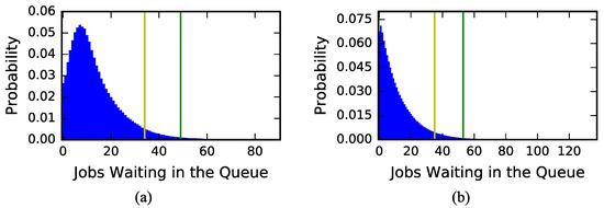 Normalized histogram plot of the discrete-event simulation of queue occupancy. This is for two sets of parameters with Poisson arrivals. The 95th percentile is marked with the yellow vertical line and the 99th percentile is marked with the green vertical line. (a) , , , , (b) , , , , .