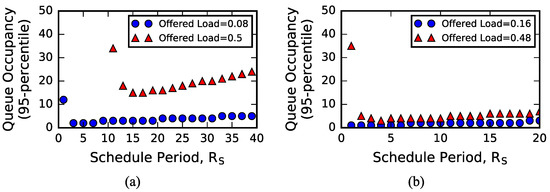 Discrete-event simulation of queue occupancy (95th percentile) vs. schedule period. This is for two sets of parameters with Poisson arrival distribution. The points are empirically measured via the discrete-event simulation. (a) , , (b) , , .