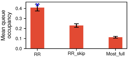 Mean queue occupancy for each scheduler design. Error bars are at the 99% confidence level. RR is the round-robin scheduler. RR_skip is the round-robin skip scheduler. Furthermore, Most_full is the capacity prioritization scheduler. The blue × is the predicted mean queue occupancy by the analytical model.