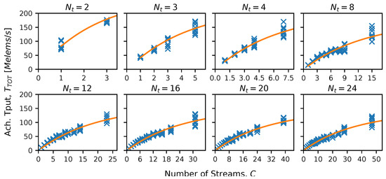 We measure on 10 independent runs for and 14, and C ranging from 1 to 28 streams (i.e., up to 2 pipeline registers are included per round). Curve fitting the model in (19) across all the data sets yields