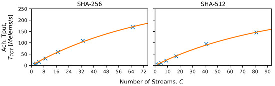 We measure on 10 independent runs for an FPGA for SHA-256 and SHA-512 with C ranging from 1 to 81 streams (i.e., up to 1 pipeline register per round plus 1). Curve fitting the model in (19) across data sets yields: