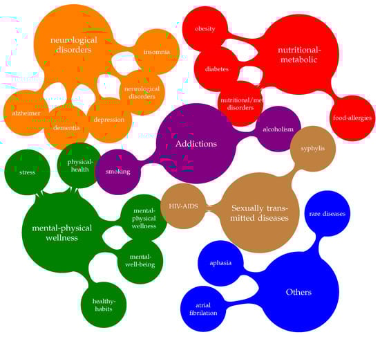 In the context of eHealth and assistive application scenarios, well-known properties such as anonymity, asynchronicity, personalization, scalability, authentication, and consumability represent an inherited plus for the applications leveraging on chatbot technologies [38]. In this context, the most relevant application scenario are chronic illness attention [39,40], interviews [41,42], counseling [43,44], chronic health conditions monitoring [45,46], medication adherence [47,48], self-care [49], promoting healthy behavior [7], counseling and social therapy [50], and primary care [40]. According to Pereira and Diaz [38], in the context of behavioral change, chatbots are employed in a three-dimensional space considering illnesses (or health issues), competencies (e.g., cognition, behavior, and monitoring), and enablers (e.g., anonymity, asynchronicity, and scalability). From their analysis, the main categories characterizing the illness dimension are organized in Figure 1. Besides the specific contribution, the solutions elaborated in [38] are generally not usable in mobile phones, mostly due to browser-plugin requirements or assumption of large-screen availability. Such a drawback hampers the usability, losing the chatbots’ inherited advantages (particularly timeliness, pervasiveness, and accessibility).