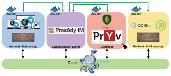 The framework comprises four main components: Database(s), Communication Server, MAS back-end for the doctor agents, and MAS for the user agents and front-end. Each of these components is deployed on a dedicated container and managed through Docker Compose.