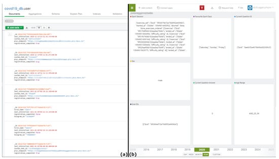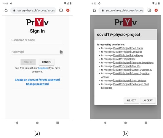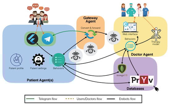 - The Database component encloses two different databases: (i) MongoDB, used as centralized storage only for non-personal data. In particular, it stores the user’s messenger service chat ID (e.g., Telegram) and the user-specific endpoint token for the personal data store. (ii) Pryv (Available online: https://www.pryv.com/ (accessed on 5 March 2021)), which is a platform enabling privacy regulation-compliant, stream-based personal data collection, and privacy management. Once a user has registered an account, the user can provide consent to external applications, which then can access and store specified data. EREBOTS uses an instance of Pryv to persist the user’s chat history and all personal data (e.g., age, name, and scenario-specific data). Employing Pryv, users gain exclusive control of their data, thus being able to revoke the consent at any point, disabling EREBOT access to it, and, if necessary, fully removing any stored piece of information.