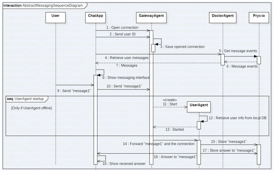 Listing 4 shows an extract of the log generated by a communication occurring via the Telegram front-end and directed to the gateway agent. The process starts by receiving the first message from a given Telegram username, i.e., “John” (Line 1). It triggers the gateway agent to search for the user in its cache (Line 2). In this extract, the research is unsuccessful. Thus, the Gateway Agent contacts the Doctor Agent, who queries the local MongoDB instance. (Line 3). Such a mechanism is necessary due to the availability of multiple user interfaces (i.e., Telegram and HemerApp), research still unsuccessful. Thus, the Doctor Agent creates a new MongoDB object for John (Line 4). In turn, the Gateway Agent creates the associated User Agent, and the underlying MAS framework (i.e., SPADE) registers a new user in the XMPP server and links it to the user agent (Lines 5–7). Once the creation concludes successfully, the message triggering the registration is forwarded to the proper User Agent (Lines 8–9), which continues the user’s profiling as instructed (Lines 10–13).