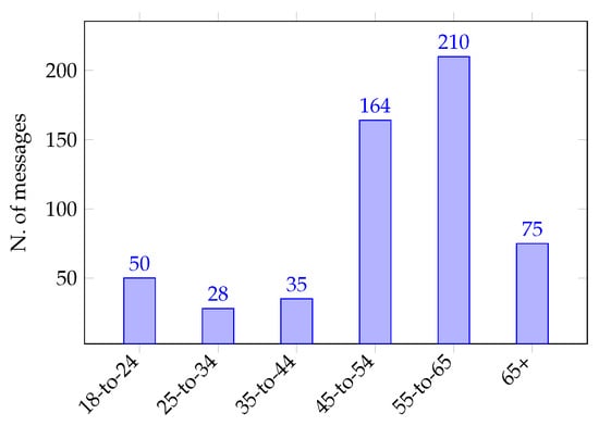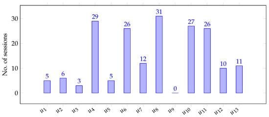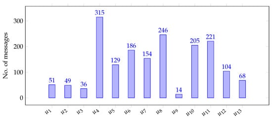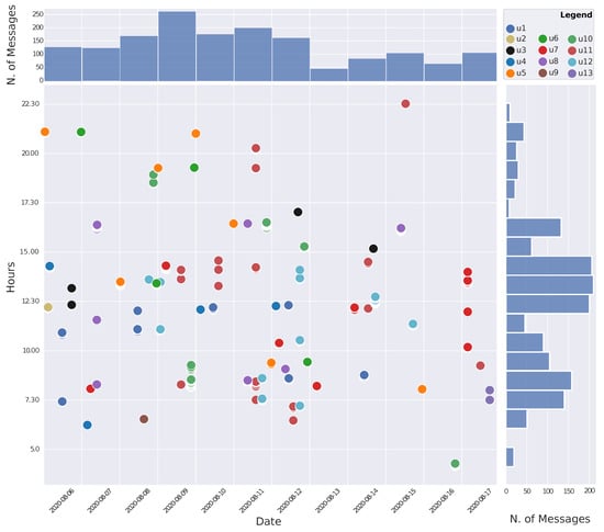 Figure 24 provides a comprehensive overview of the users’ behaviors during the testing phase. In particular, it is possible to see the time (hour/day) of any exchanged message per user and the related sum during the day and day out of the entire period. We can notice that most of the interactions have crowded between 7:00–10:00 and between 12:00–14:30. In terms of involvements over the days, most of the interactions occurred in the fourth day, followed by a gradual relapse to then increase again.