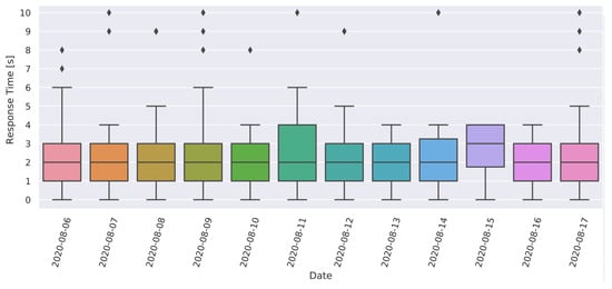 In terms of system performance, the messages’ response time (time elapsed from the moment a user has sent a message to the moment he/she receives a reply) recorded during the testing is shown in Figure 23. Overall, the mean is centered on 2 s, which defines an optimal trade-off in terms of human usability. Nevertheless, a few outliers have been recorded. Such specific situations have been generated by the users who carried out the testing over Telegram and triggered a security time-out imposed by the platform to prevent flooding risks (In Telegram, any third-party can use the chatbot APIs. Therefore, to limit the chatbot traffic, Telegram has applied limits for the interleaving of messages containing multimedia files or being heavier than a given limit; Available online: https://github.com/python-telegram-bot/python-telegram-bot/wiki/Avoiding-flood-limits (accessed on 5 March 2021). In HemerApp, such limitations are not necessary since the chatbot’s behavior is ruled by in-house developed agents.