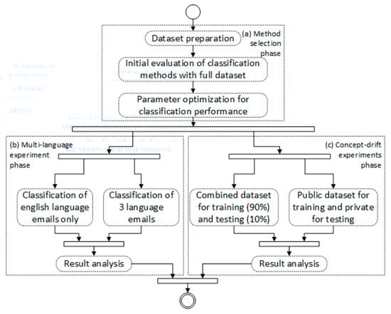 As the dataset includes 700 spam and 700 phishing emails we do not use deep neural networks and concentrate on the usage of the most used classification methods. The research is divided into three main phases (see Figure 1): Figure 1a method selection Figure 1b multi-language-experiment Figure 1c concept-drift-experiment.
