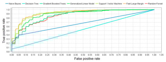 ROC (receiver operating characteristic) curves of different classification methods, used for initial email message classification to spam and phishing.