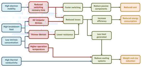 WBG semiconductor parameter capabilities (blue); physical properties affected by WBG advantages (red); power electronics characteristics (green); and product benefits (yellow).
