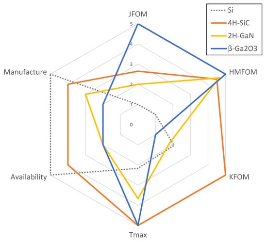 - Baliga, B.J. Power Semiconductor Device Figure of Merit for High-Frequency Applications. IEEE Electron Device Lett. 1989, 10, 455–457. [Google Scholar] [CrossRef]