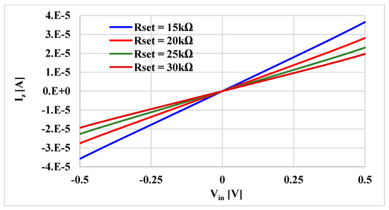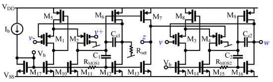 Figure 3 shows the realization of VD-DIBA with two multiple-input OTAs. The OTA1 with a negative feedback connection and the resistor Rset create a transconductance stage (gm). The transconductance is adjustable with Rset and its value is approximately given by gm≈1/Rset [41]. If the transconductance value needs to be electronically controlled, then Rset can be replaced, for instance, by a voltage-controlled resistance based on a simple CMOS circuitry. It is worth noting that the negative feedback connection of OTA1 significantly enhances the linearity of the transconductor compared with conventional OTA, which uses the bias current to set its transconductance value [41]. The second multiple-input OTA2 with unity gain feedback is used to transfer the voltage difference between z and v terminals to the output terminal w.