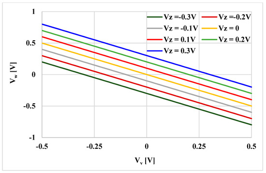 To validate the performances of the voltage differencing differential input buffered amplifier (VD-DIBA) in Figure 4, extensive simulations in the Cadence/Spectre environment were performed, assuming the 0.18 μm TSMC CMOS technology. The transistor aspect ratios, capacitors, voltage supply, and bias current values are included in Table 1. The total power consumption was 0.99 mW. Figure 6 shows the DC transfer characteristic of the transconductance stage for different resistances Rset = 15, 20, 25, and 30 kΩ. It is worth noting the tunability and the good linearity obtained over a differential input range of −0.5 to 0.5 V. Figure 7 shows the output voltage Vw against the input voltage Vv for different values of Vz. The correct operation of the voltage differential unit is clearly visible. The frequency responses of Vw/Vv and Vw/Vz are shown in Figure 8. The histogram of the low frequency gain at 1 kHz and the −3 dB bandwidth of these responses with Monte Carlo (MC) analysis are shown in Figure 9, Figure 10, Figure 11 and Figure 12. For Figure 9 and Figure 10, the mean value of the gain is −7.07 and 5.79 mdB, while the standard deviation is 0.19 and 0.39 mdB for the Vw/Vv and Vw/Vz gain, respectively. For Figure 11 and Figure 12, the mean value of the −3 dB bandwidth is 6.37 and 6.11 MHz, while the standard deviation is 121.5 and 89 kHz for the Vw/Vv and Vw/Vz gain, respectively. The MC analysis confirms the low sensitivity of the VD-DIBA to transistor mismatch.