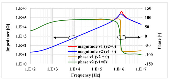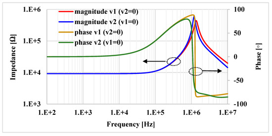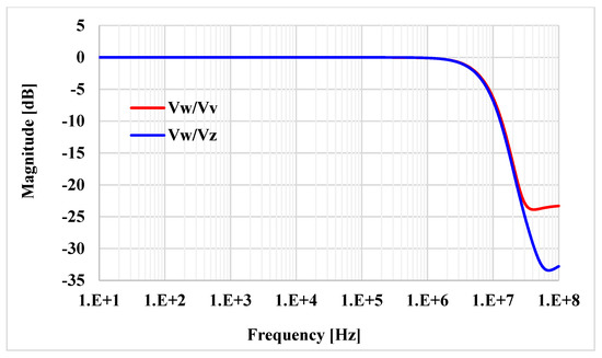 Note that the proposed floating series L-R simulator in Figure 16 is synthesized from the same lossy integrator as proposed in [31]. However, the series L-R simulator in [31] only gives the grounded impedance. Additionally, the w terminal is connected to the v terminal to achieve two types of inductance value. With this connection, it is difficult to be modified as a floating type. Another advantage of the proposed floating series L-R simulator in Figure 16 is that, if the second port (v2) is assigned as an output voltage node, then a low output impedance is achieved.