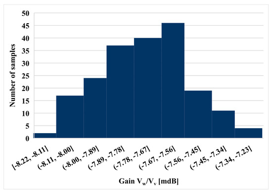 A histogram of the voltage gain Vw/Vv with 200 runs Monte Carlo (MC) analysis.