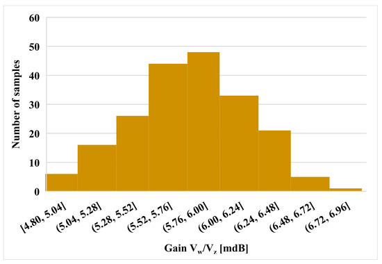 A histogram of the voltage gain Vw/Vz with 200 runs MC analysis.
