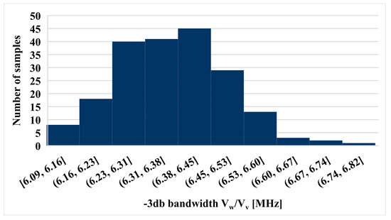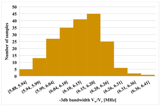 A histogram of the −3 dB bandwidth Vw/Vv with 200 runs MC analysis.