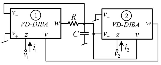 - Bajer, J.; Vavra, J.; Biolek, D. Voltage-mode quadrature oscillator using VD-DIBA active elements. In Proceedings of the IEEE Asia Pacific Conference on Circuits and Systems (APCCAS 2014), Ishigaki, Japan, 17–20 November 2014; pp. 197–200. [Google Scholar]