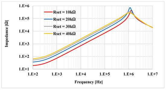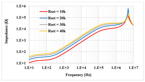 The simulated impedance (both the magnitude and phase) of the floating inductance-resistance simulator with Rset = 10 kΩ is shown in Figure 21. The simulated inductance and resistance values are about 12.39 mH and 9.22 kΩ, respectively. The impedance of the floating series L-R for different values of Rset is shown in Figure 22, where Rset had four values (10, 20, 30, and 40 kΩ). The inductance values simulated from these Rset values were 12.39, 23.38, 30.92 and 35.29 mH, respectively. Additionally, the resistance values simulated from these Rset values were 9.22, 16.88, 23.41, and 29.04 kΩ, respectively. The simulation performed on the floating parallel inductance-resistance simulator is shown in Figure 23. The simulated inductance and resistance values were about 11.28 mH and 9.43 kΩ, respectively. The impedance of the floating parallel L-R for different values of Rset is shown in Figure 24, where Rset was changed to four values (10, 20, 30, and 40 kΩ). The inductance values simulated from these Rset values were 11.28, 21.48, 30.81, and 39.41 mH, respectively. Furthermore, the resistance values simulated from these Rset values were 9.22, 17.36, 24.08, and 29.79 kΩ, respectively.