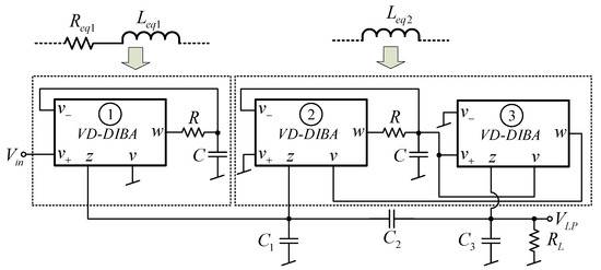 Note that the voltage differencing unit at the output stage of VD-DIBA is very useful for realizing the voltage difference v1 − v2. Equation (2) obviously shows that the input impedance of the block diagram presented in Figure 13 can be considered the impedance of a floating lossless inductance simulator, where its equivalent inductance is given by