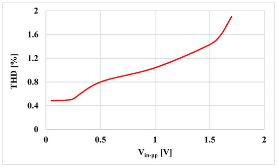 The process, voltage, temperature (PVT) corner analysis was also performed for the proposed VD-DIBA. The MOS transistor corners were [ss, sf, fs, ff], the capacitor corners were [slow, fast], the temperature corners were [−10 °C, 80 °C], and the voltage supply corners +VDD = −VSS were [895 mV, 905 mV]. The results of this analysis, including the minimum, typical, and maximum values, are summarized in Table 2 and confirm the acceptable performance of the circuit under PVT variations.