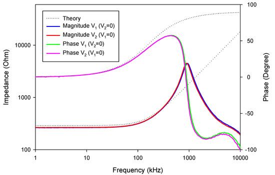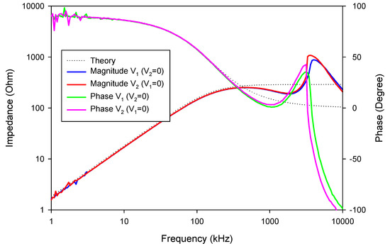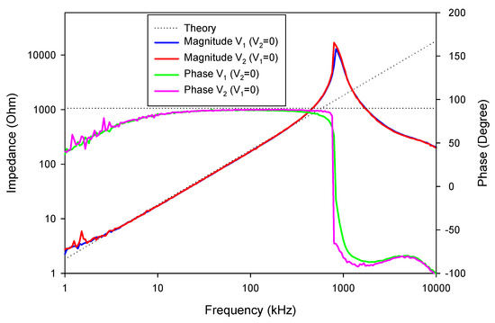 The frequency and phase responses of the parallel L-R connection with Rset = 10 kΩ.