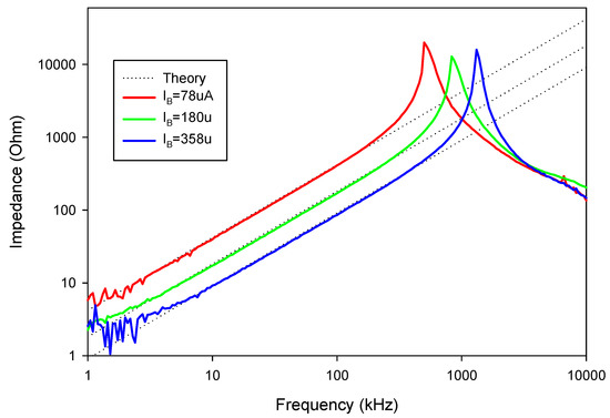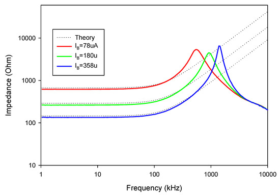 The experimental impedance of the floating series inductance-resistance simulator is shown in Figure 36, where the inductance and resistance values are about 0.346 mH and 0.264 kΩ, respectively. The impedance of the floating series L-R connection for different values of IB is shown in Figure 37, where IB values were changed to obtain the three values of 78, 180, and 358 µA. The experimental inductance values obtained from these IB values were 1.38, 0.346, and 0.15 mH, respectively, while the experimental resistance values obtained from these IB values were 0.623, 0.264, and 0.135 kΩ, respectively. The experimental result for the floating parallel inductance-resistance simulator connection is shown in Figure 38, where the inductance and resistance values were about 0.269 mH and 0.25 kΩ, respectively. The impedance of the floating parallel inductance-resistance connection for different values of IB values is shown in Figure 39, where IB values were set as 78, 180, and 358 µA. The corresponding inductance values were 0.639, 0.269, and 0.132 mH, respectively, while the resistance values were 0.603, 0.25, and 0.121 kΩ, respectively.