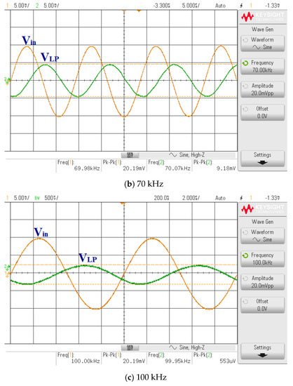 The 4th order elliptic LP ladder filter realized from the proposed inductance simulators in Figure 26 was experimentally tested by selecting C1 = C2 = C3 = 10 nF and RL = 0.25 kΩ. The resistors and capacitors in the inductance simulators were C = 1 nF and R = 1 kΩ, respectively, while the value of the bias current was IB1 = IB2 = IB3 = 208 µA. This yielded Leq1 = Leq2 = 0.25 mH and Req1 = 0.25 kΩ. Figure 40 shows the experimental frequency responses of the 4th order elliptic LP ladder filter based on VD-DIBA compared with the theoretical response of the RLC prototype filter. The gain is −5.9 dB and bandwidth (BW) is 83.17 kHz, while for the RLC prototype, the gain is −6.02 dB and BW is 85.41 kHz. The transient responses of the LP ladder filter are shown in Figure 41, where sine wave signals with peak-to-peak of 20 mVpp at 10, 70, and 100 kHz were applied to the input of the filter. Figure 42 shows the experimental frequency and responses of the LP ladder filter with a different bias current and IB1 = IB2 = IB3 = 52, 104, and 208 µA, respectively. The BW was 19.95, 57.54, and 83.17 kHz, respectively. It was found that the BW or the cut-off frequency is electronically controlled by the bias currents.
