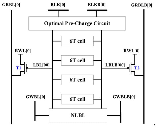 Four memory cells connected with local bit-line pair LBL [00] and LBLB [00] which minimizes the parasitic capacitance on the bit-line and reduces the read error. The memory cell reads data "1" and the local bit-line LBLB [00] is discharged into the cell through the transistor T4. The transistor T3 and transistor NCL have a small current, the four memory cells of the local bit-line significantly decrease the leakage currents. To increase the read stability and improve the RSNM, the global read bit-line (GRBL/GRBLB) avoids memory cell leakage currents. The sense amplifier (SA) reads the data out to charge the global read bit-line GRBLB [0] through transistor T2, there has a small parasitic capacitance which makes the read operation faster. The voltage of block selection lines BLKB [0] and BLK [0] is not less than Vopt, so the low-voltage pre-charge circuit saves optimal voltage (Vopt) and ensures read stability of read operation.