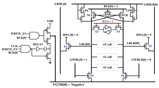 Figure 2 displays the negative local bit-line scheme and the process of the write operation. The global write bit-line pairs GWBL [0] and GWBLB [0] are operated for write data by the following transistors T5 and T6. The Negative Virtual Ground (NVGND) in the column direction is attached to the LBL [00] or LBLB [00] to switch on the transistor T5 or T6, then pulls the other side to VDD via cross transistors NCL and NCR. At first, the block selection lines set BLKB [0] is ‘0’, BLK [0] as ‘1’ then the GWBL [0] or GWBLB [0] set ‘1’, to switched on transistor T5 and T6. The other side of the bit-line LBL/ LBLB is engaged through the NCL/NCR to the VDD, and the word-line WL [0] sets ‘1’ to write for the memory cell. By sharing the charging capacitor, memory cells are discharged via VGND to improve the write capabilities for the near-threshold operation. For instance, the first cell discharge path through T3 to LBL [00] to pass data ‘0’, and then the LBLB [00] retained the VDD to provide additional data. In this process the LBL [00] is connected to the NLBL, the memory cell data is reversed faster during the write operation and RWL [0] is still holding data ‘0’. For the differential read-write function the proposed local bit-line SRAM has high speed, decreased parasitic capacitance, and resistance which is energy-efficient.
