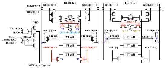 Figure 3 illustrates the half-select condition operation for row blocks of proposed local bit-line SRAM. At the write operation of BLOCK 0, the transistors T3 and T4 are used to pass data of Q and QB which is indicated by the sky-blue color. Initially, the word-line WL0 =1 becomes active that shown by the red color and Q save data ‘1’ and QB saves ‘0’. The global write bit-lines GWBL [0] =1 and GWBLB [0] =0 select data to activate the transistors T5 and T6 then the local bit-line LBL [00] turn out to be discharged through the transistor T5 to the negative voltage of VGND [0]. After discharge the local bit-line LBL [00], the Q = 0 and QB = 1 flip data in the memory cell. At BLOCK 1, the half-selected cell is affected by the word-line WL0 in the same row pseudo-read of LBL [] and LBLB [] that indicated by the orange color. The read word-line RWL [0] remains data "0" and row half-selected blocks does not charge by the global read bit-lines (GRBL/GRBLB), so the low-voltage pre-charge scheme reduces the read disturb and flip data in the memory cell. The proposed structure injects less pre-charge into cell and reduces the capacitance in the local bit-line which decline the leakage power consumption that shown by the purple color dotted line.