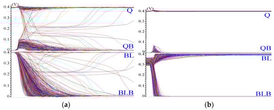 For the global variations, the process-voltage-temperature (PVT) corners that combined the extreme cases of these variables are commonly used to verify the performance. The 10,000 times Monte Carlo post-simulations were performed for the experiment to show the enhancement of read stability. At 400 mV supply voltages, the experimental result of the conventional 6 T SRAM cell is shown in Figure 6a. During the read operation, the conv. 6 T SRAM charge on the bit-line pair destroyed the data store in the memory cell, flipped the data store in the cell, and reversed several read errors and data flips. Alternatively, the proposed local bit-line SRAM uses a low-voltage pre-charge scheme to optimize the voltage and achieved the stability of the cell without any read errors at the same supply voltage the result is shown in Figure 6b.