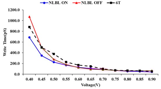 The comparison and write ability simulation result for the different operating voltages is shown in Figure 7. The differential write operation is considered to write speed of data "0" and "1", the write operation is affected by the transition point of the cross-coupled inverter. However, the NLBL technology that included with the proposed design, so the write ability of the memory cells has improved and provides better performance. Compared to the conv. 6 T SRAM, the write speed of the proposed design has improved about 22% at the 400 mV operating voltage.