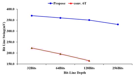 Figure 8 shows the difference between conv. 6 T SRAM and the proposed bit-line swing at 400 mV supply voltage. During the read operation, the bit-line pair has a different voltage because of the leakage current of all column half-select cells. The voltage difference of conv. 6 T SRAM is less than 200 mV at 128 bits, which causes the bit-line swing is too small for the SA that cannot succeed stability. The proposed local bit-line SRAM maintains the voltage difference of more than 300 mV and bit-line depth is changed to 256 bits.
