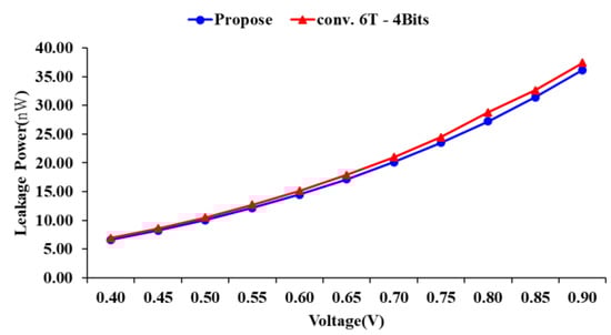 The static leakage power consumption of the memory cell is shown in Figure 9. Although the proposed architecture increases the metal–oxide–semiconductor field-effect transistor (MOSFET) number but effectively reduces the leakage current on the bit-line and the static leakage power consumption. The proposed design effectively reduces the bit-line leakage current and static leakage power consumption compared to the conv. 6 T SRAM.