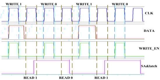 The implemented architecture 1 kb SRAM macros (128 rows × 8 columns) has 32 blocks in each column and each block consists of 4 memory cells. By using the Hspice EDA tool, the waveform of post-layout simulation is shown in Figure 11 at 400 mV/25 MHz. The WRITE_EN is the write control signal that controls the GWBL/GWBLB decoder, write driver circuit and NLBL scheme circuits to start work when WRITE_EN is "1". At first set input data is "1" to test the write status parameter. The selected memory cell stores data "1" during the write cycle "1" and reads the status, then the sense amplifier starts operating and pulls up the SA and latch to "1" which means the read and write operation both are successful. If WRITE_EN is "0" then the read operation starts to work. Similarly, when the write data is "0" the selected memory cell stored data "0" and the read status start, the SA and latch is also pulled down to "0". These parameters speed up the proposed local bit-line SRAM to operate at the near-threshold operation by reducing read error strengthening the write ability.
