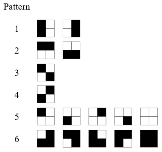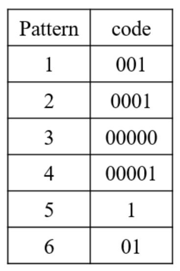 The bitmap is divided into several non-overlapping sub-blocks with a size of . Then, according to Figure 1, each sub-block can match a pattern, where a black grid represents “0” in the bitmap, and a white grid represents “1” in the bitmap. Each pattern reserves an edge direction of the original image, including the vertical, horizontal, slash, and full directions. In more detail, pattern—1 represents vertical, pattern—2 represents horizontal, pattern—3 represents left slash, pattern—4 represents right slash, and pattern—5 and pattern—6 represent full H and full L, respectively. After classifying all the sub-blocks, the bitmap of the sub-blocks can be replaced by the Huffman code. Figure 2 depicts each pattern’s Huffman code, and the Huffman coding length of each pattern is different, depending on the frequency of each pattern. An example is given below: